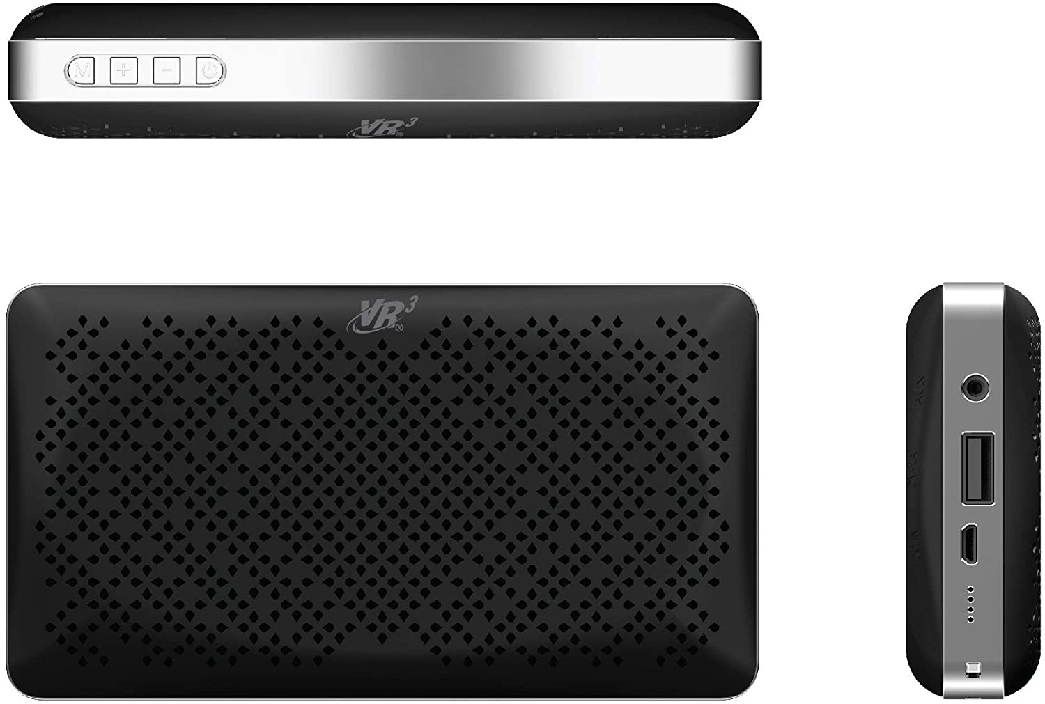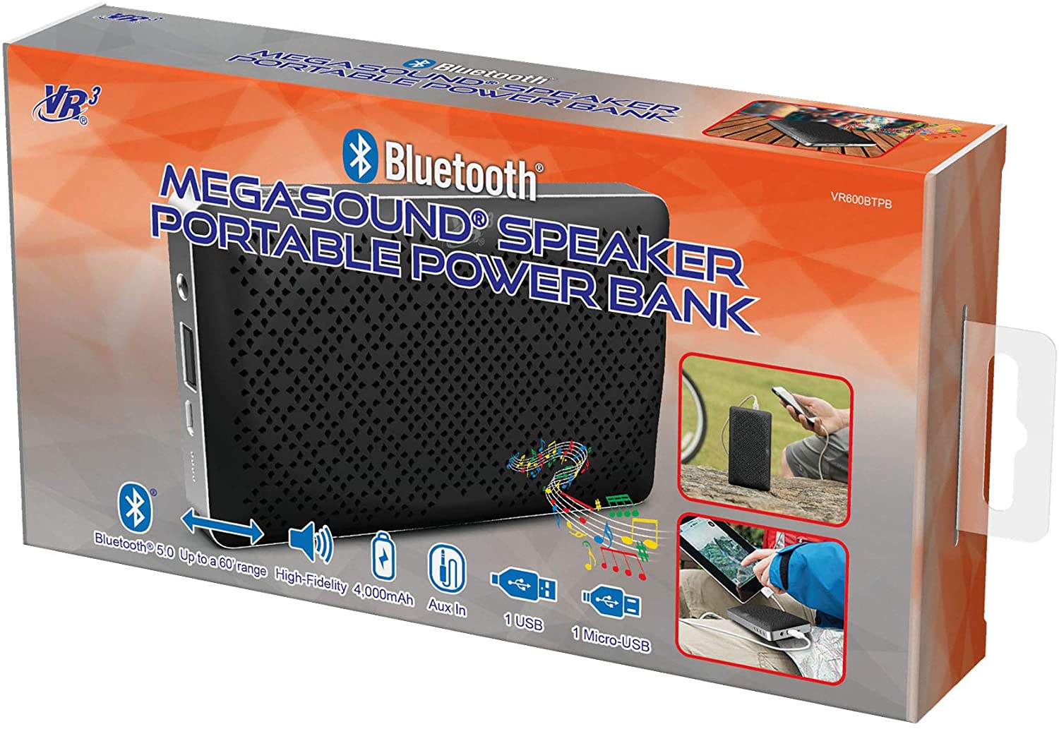 Enjoy music and charge your phone with your new VR3 Bluetooth Speaker and Portable Power Bank. Bluetooth 5.0 delivers crisp, full-range audio from your Bluetooth enabled device. The 4,000mAh Power Bank helps you keep your devices charged on the go. Includes 1 USB, 1 Micro USB and 1 Aux Input jack.