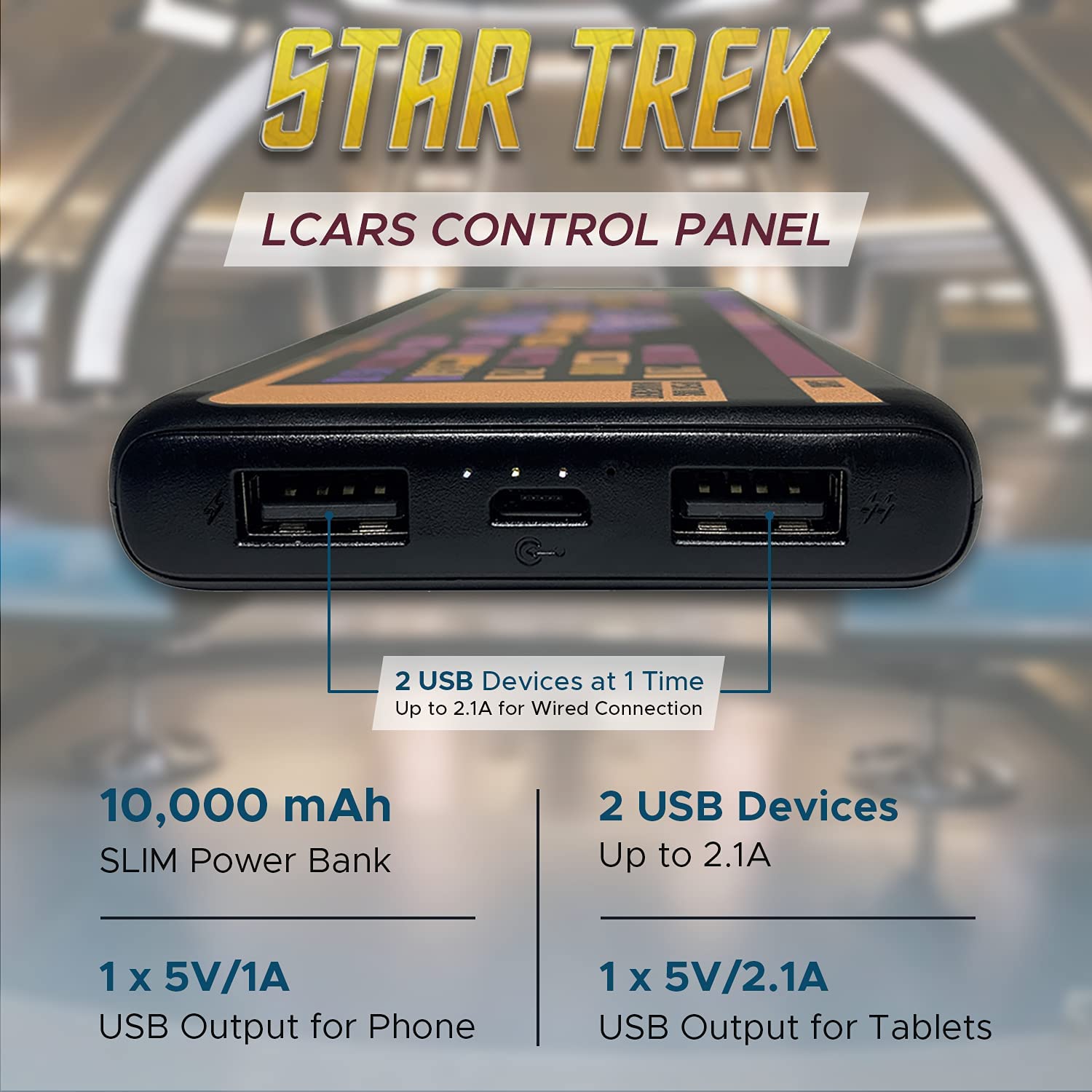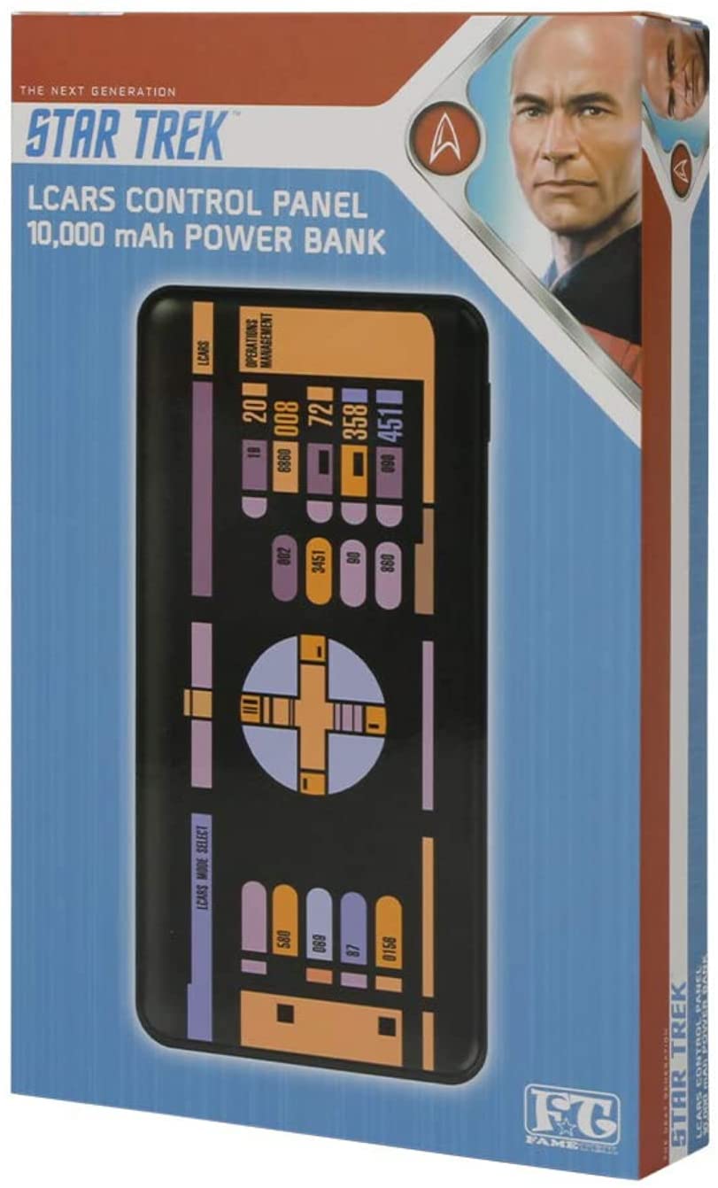 • THE GIFT THAT KEEPS ON GIVING | The Star Trek Power Bank with TNG LCARS Design allows you to charge your phone conveniently and in style. FameTek’s design for an efficient and high-speed charging allows 2 USB devices at 1 time. Up to 2.1A for wired connections that work for all products that use USB charging.