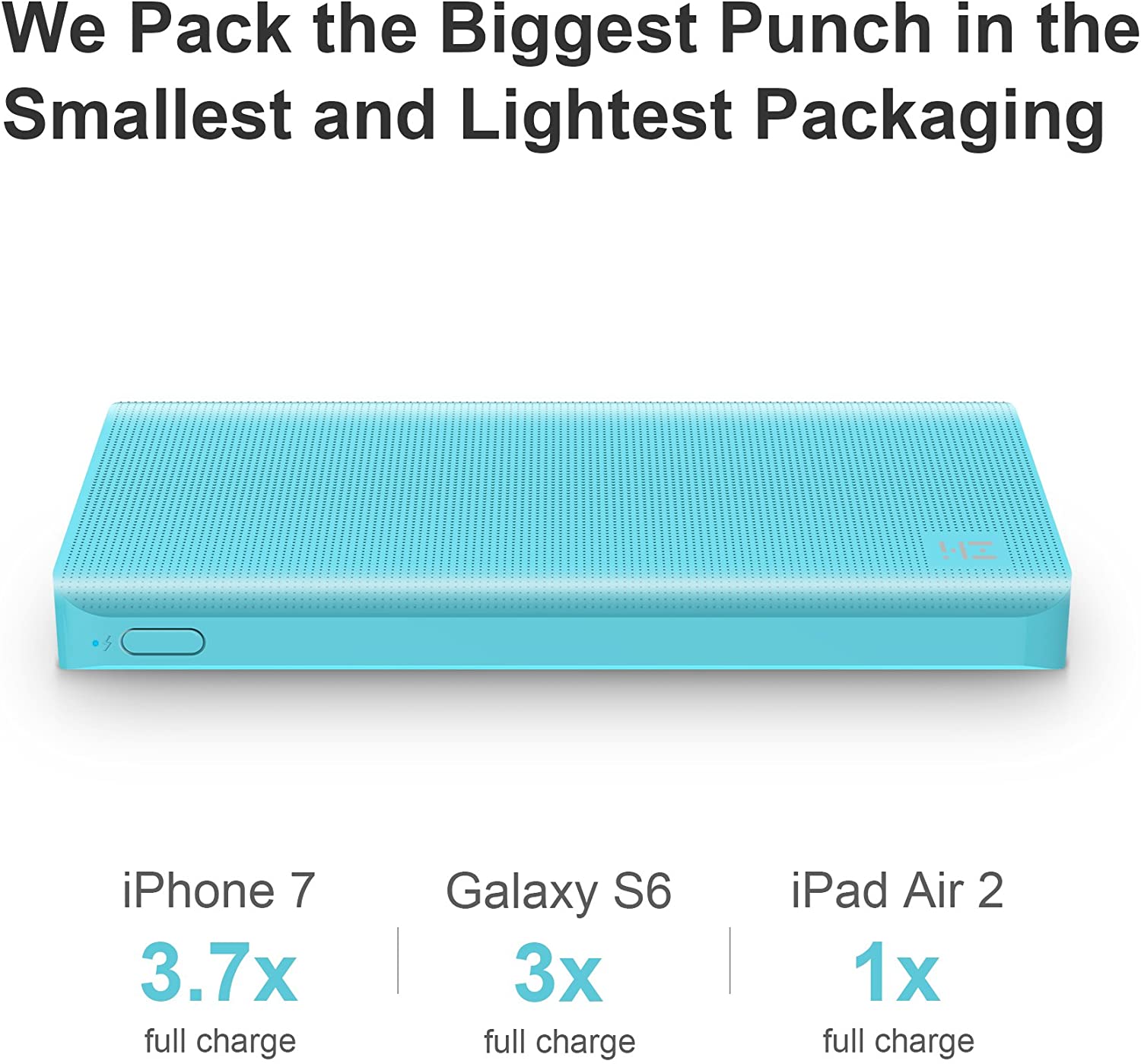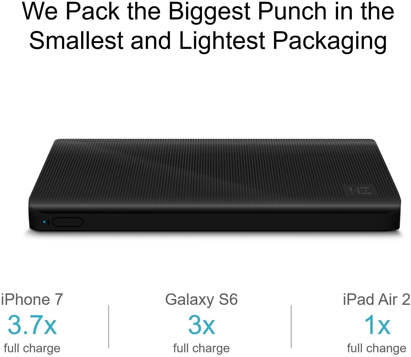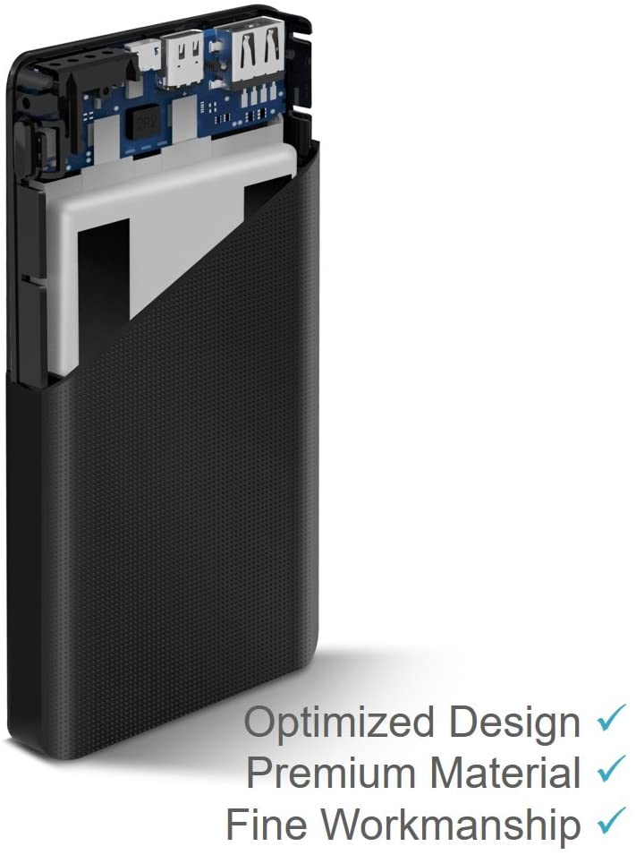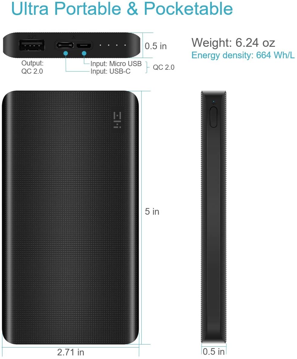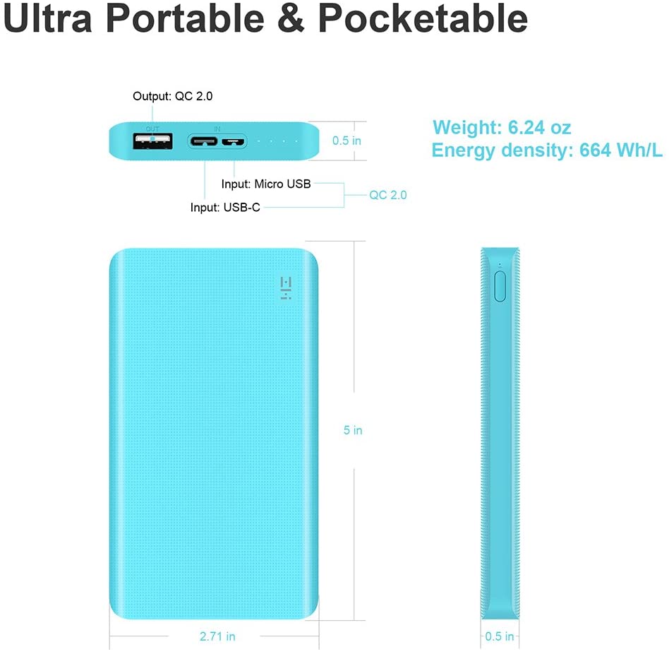 - POCKETABLE AND VERSATILE: The smallest and lightest 10000 mAh portable battery pack on the market – only 6.2 oz and 40% thinner than most 10000 mAh power banks. Perfect for your pocket or bag. Thoughtful anti-slip surface ensures a secure grip. Charges tablets, phones, connected watches, Bluetooth earphones & activity trackers via three modes: high-speed (Quick Charge 2.0), normal, and low-power. Dual input interface – fast rechargeable via Micro USB or USB-C port. USB-C port is for INPUT ONLY